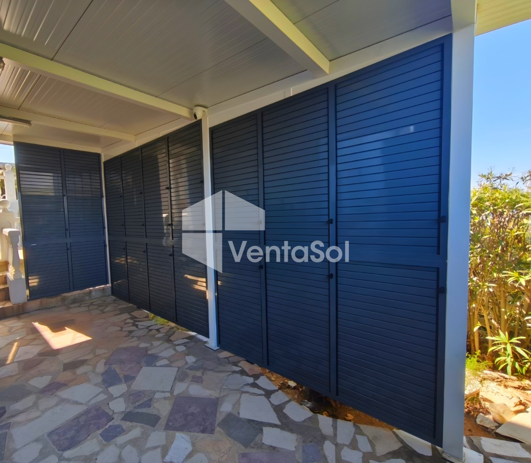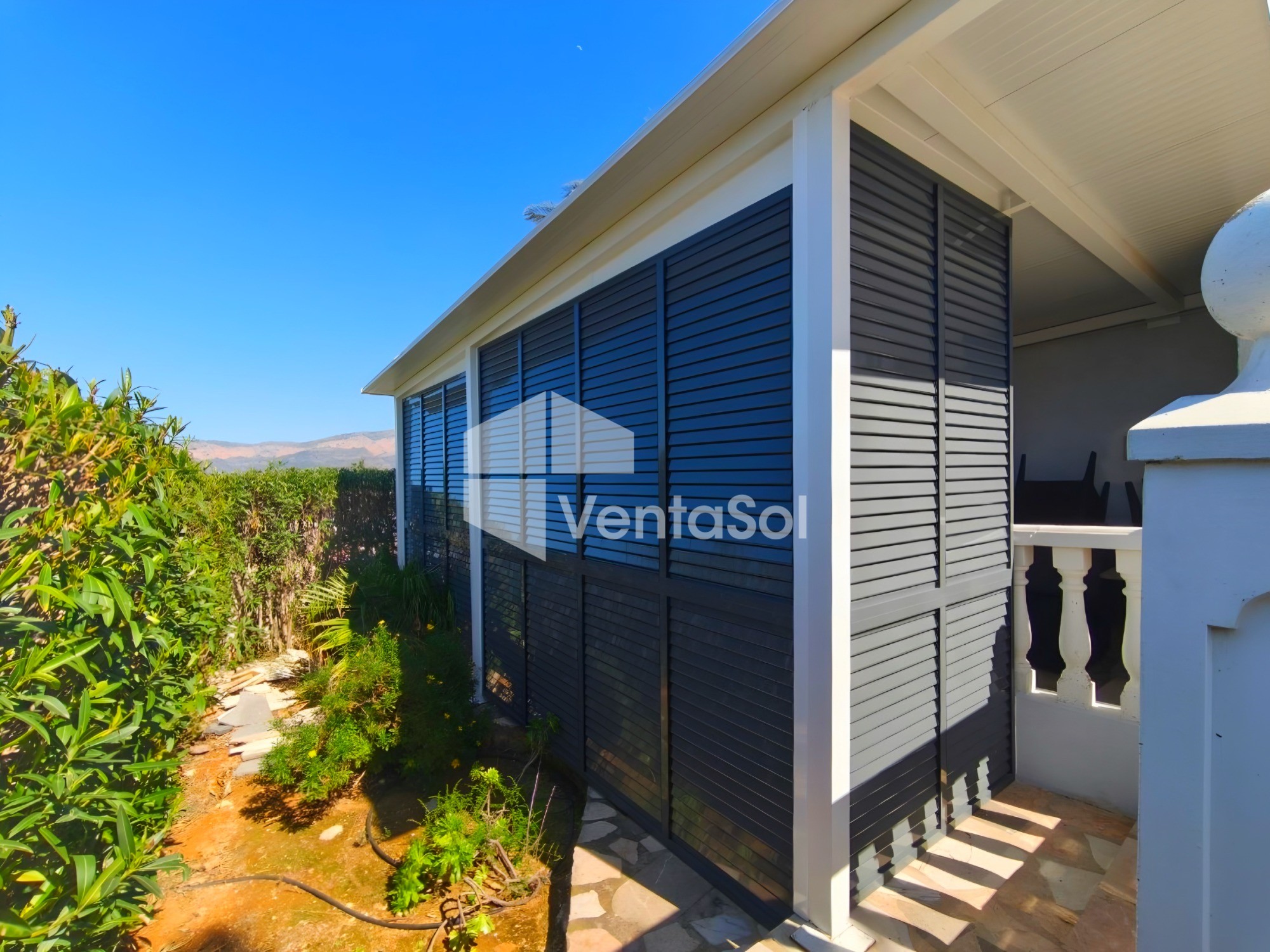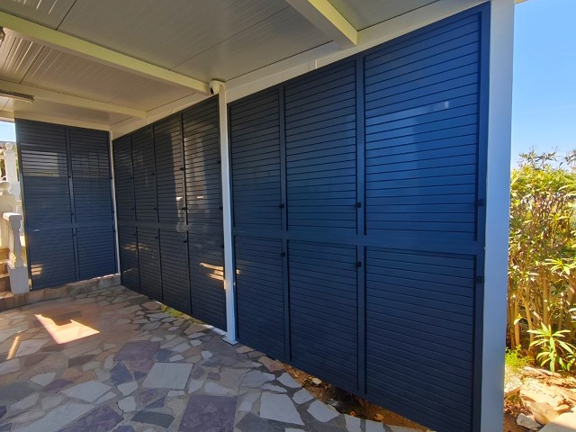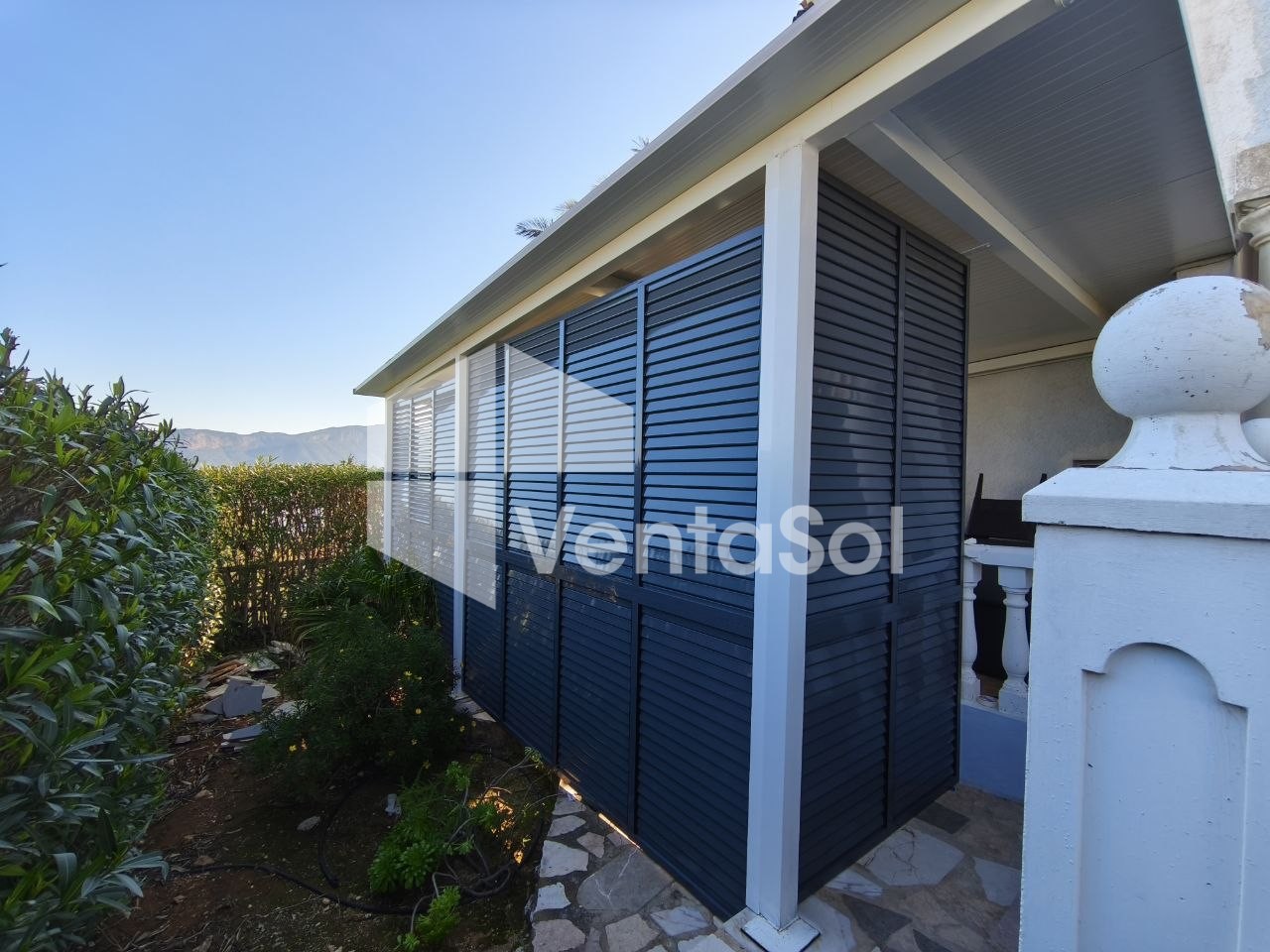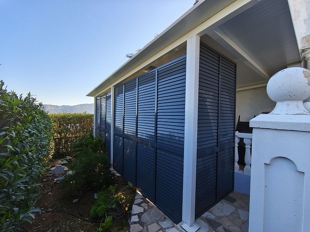 Pergola side enclosure with adjustable Majorcan-type slats